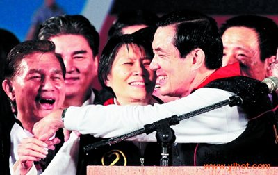 马英九赢得“大选”,抵达竞选总部发表胜选感言。马英九特别感谢夫人周美青,他说周美青是以最严格、最犀利的标准检验他、鼓励他,“我要好好谢谢她”。台下群众鼓噪“亲一下”,但马英九只有轻轻拥抱周美青。周美青是蓝营的超级大王牌,在岛内人气甚至比马英九旺。选前最后几天,周美青深入绿营票仓,探视老人,到市场握手、合照、熊抱来者不拒,有民众称赞她是“爱心天使”。